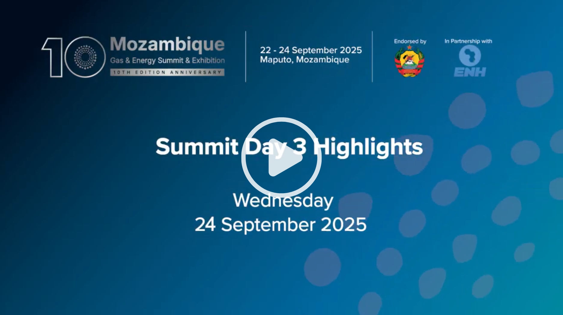 The 10th anniversary edition of the Mozambique Gas & Energy Summit & Exhibition will take place from 22 - 24 September 2025, in Maputo, Mozambique.